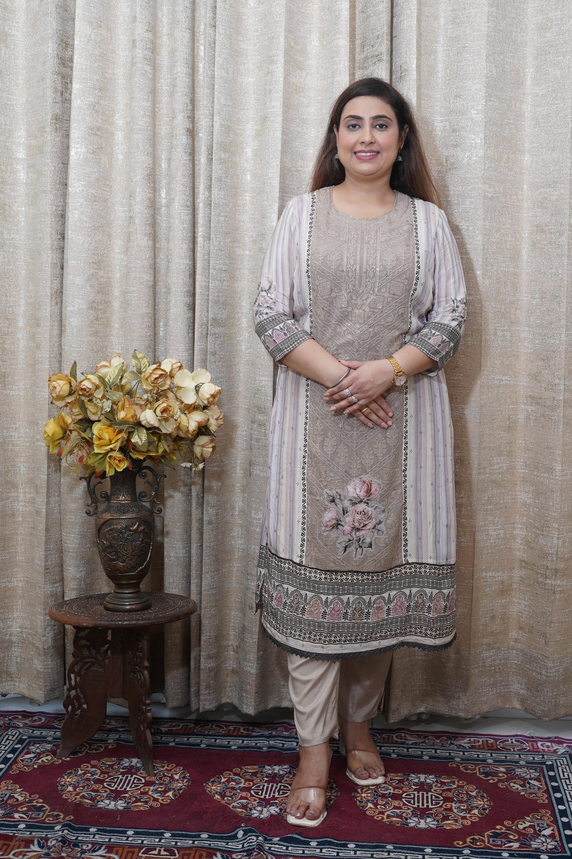 Graceful Muslin Earthy tone Pure Straight Suit with Vertical strips and thread embroidery on front .