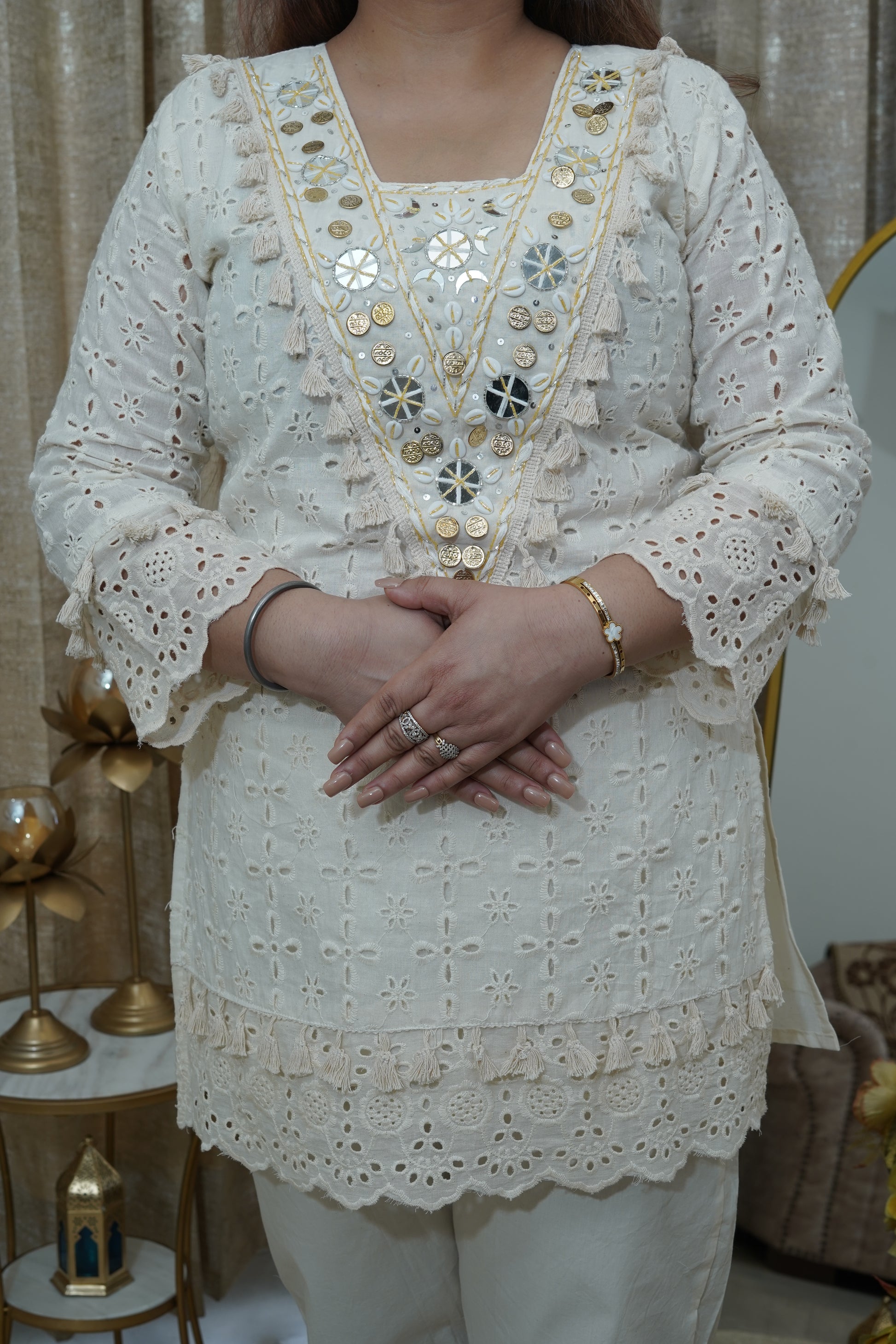 Off White cotton coord set  with floral eyelet embroidery, delicate mirror, shell work and gold coins on Neck
