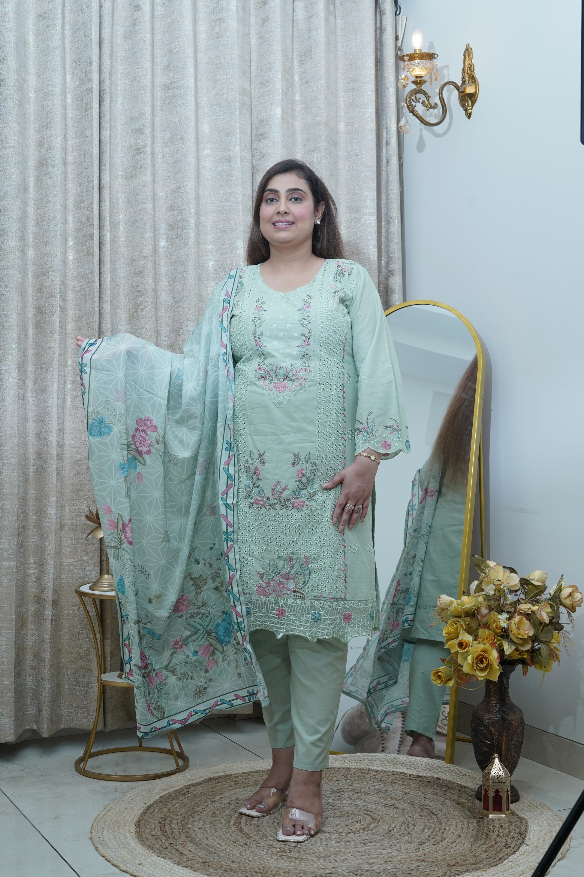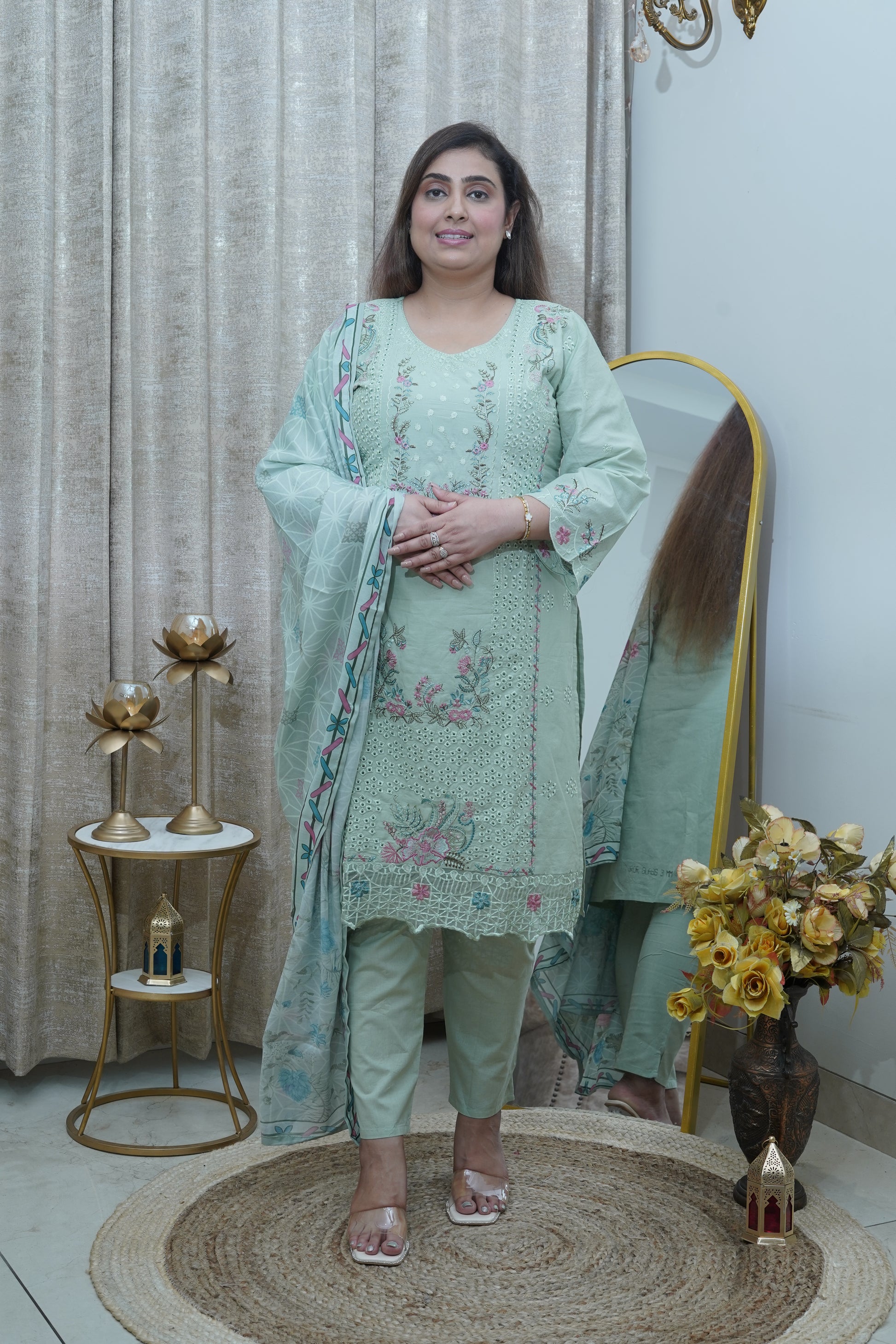 Pastel Sage Embroided Cotton Straight Suit.